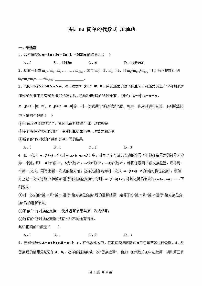 沪教版沪教版特训04:简单的代数式压轴题(原卷版)
