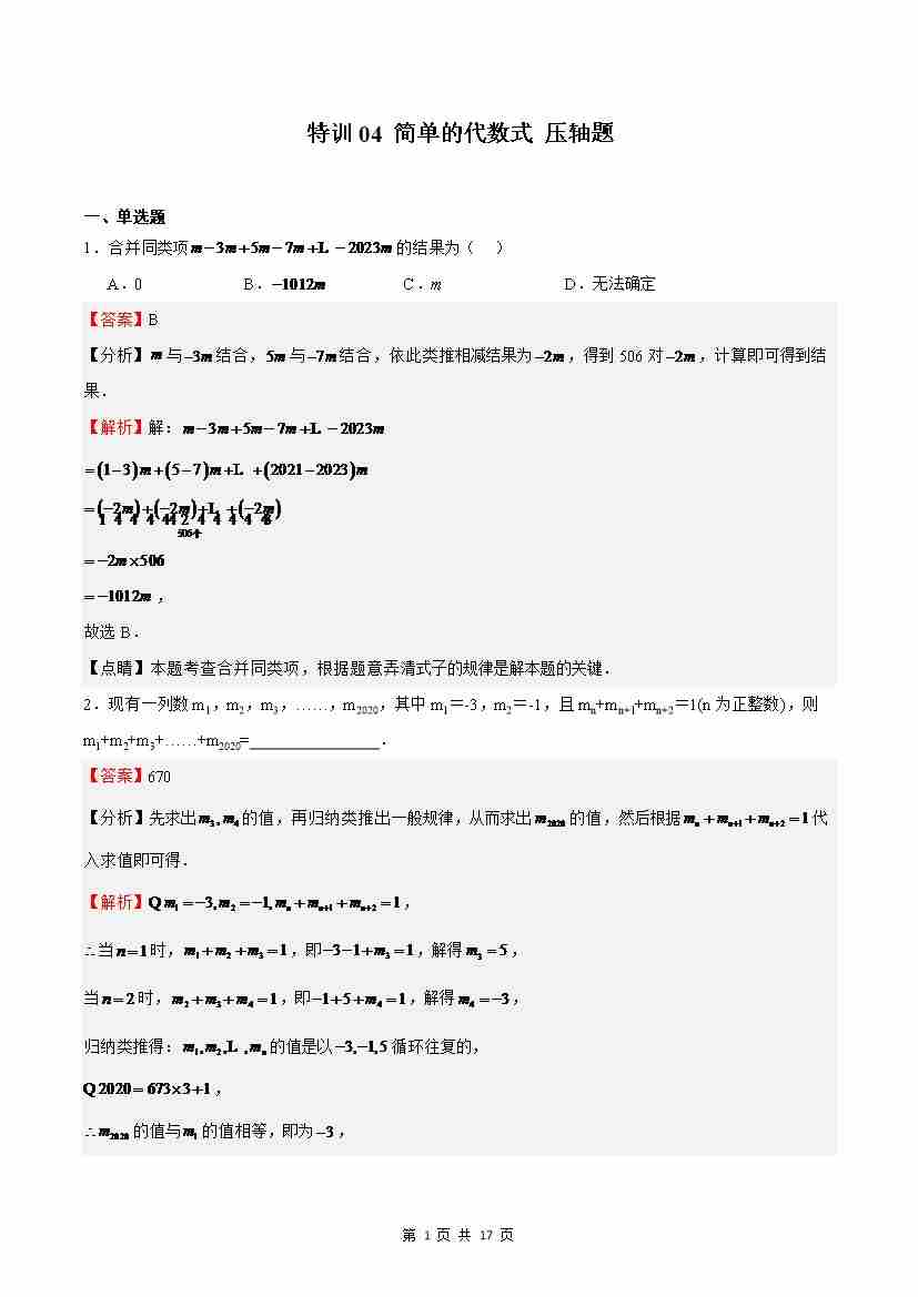 沪教版沪教版特训04:简单的代数式压轴题(解析版)