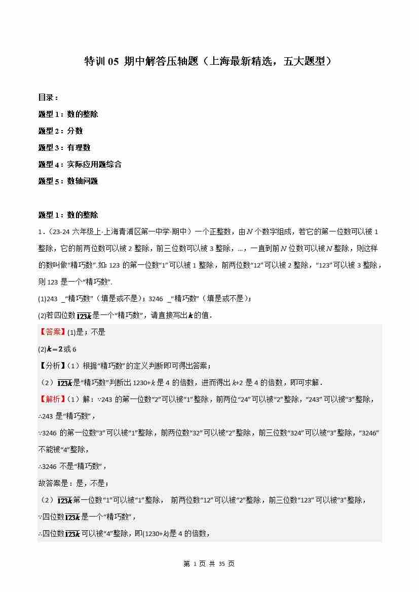 沪教版沪教版特训05:期中解答压轴题(上海最新精选,五大题型)(解析版)