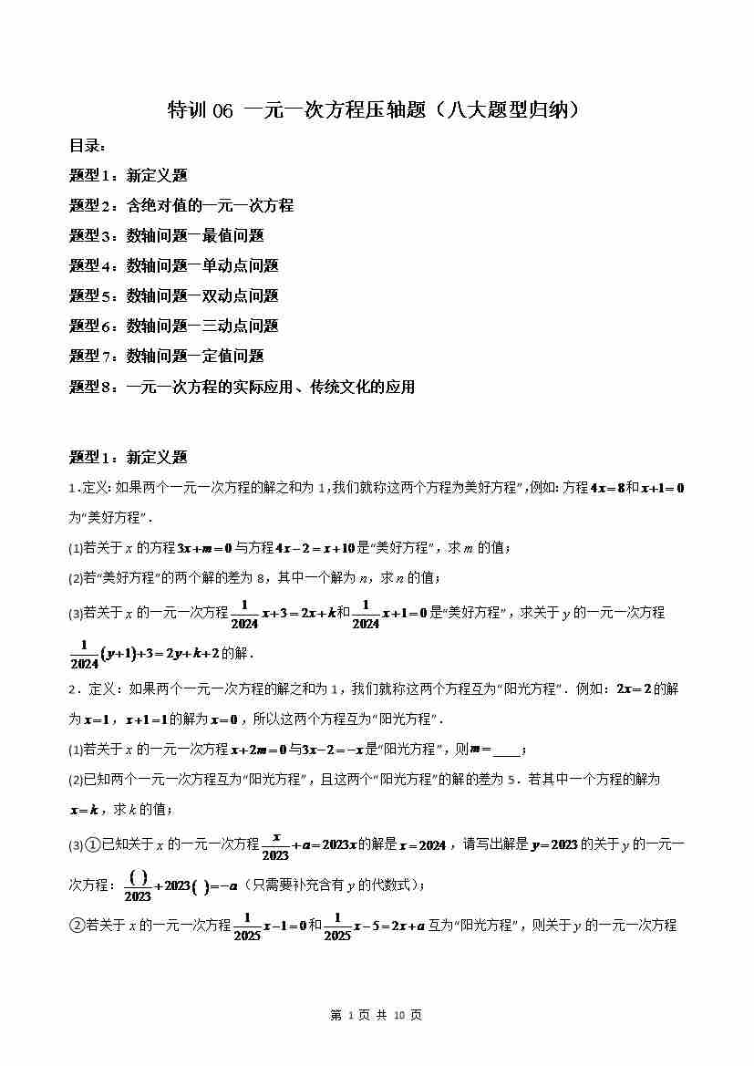 沪教版沪教版特训06:一元一次方程压轴题(八大题型归纳)(原卷版)