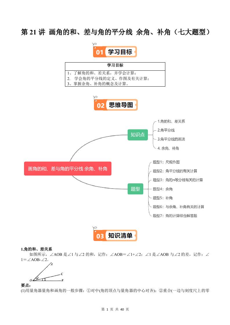 【沪教】第21讲:画角的和、差与角的平分线余角、补角(七大题型)(原卷版)