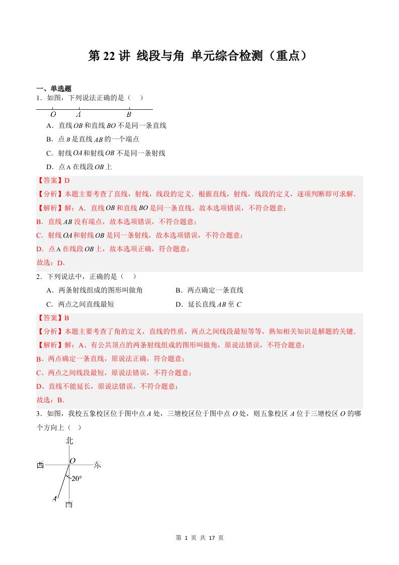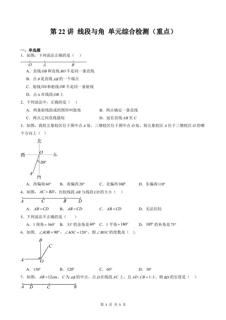 【沪教】第22讲:线段与角单元综合检测(重点)(原卷版)