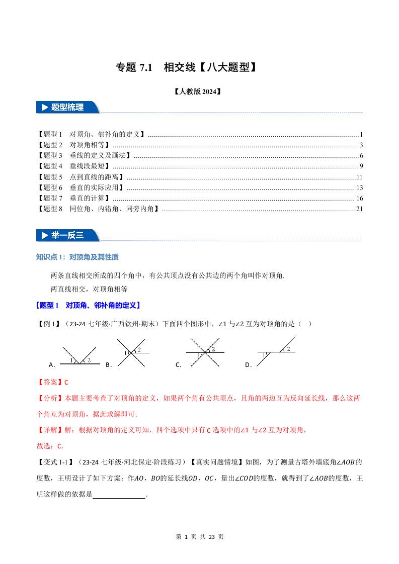 专题7.1 相交线【八大题型】(举一反三)(人教版2024)(解析版)
