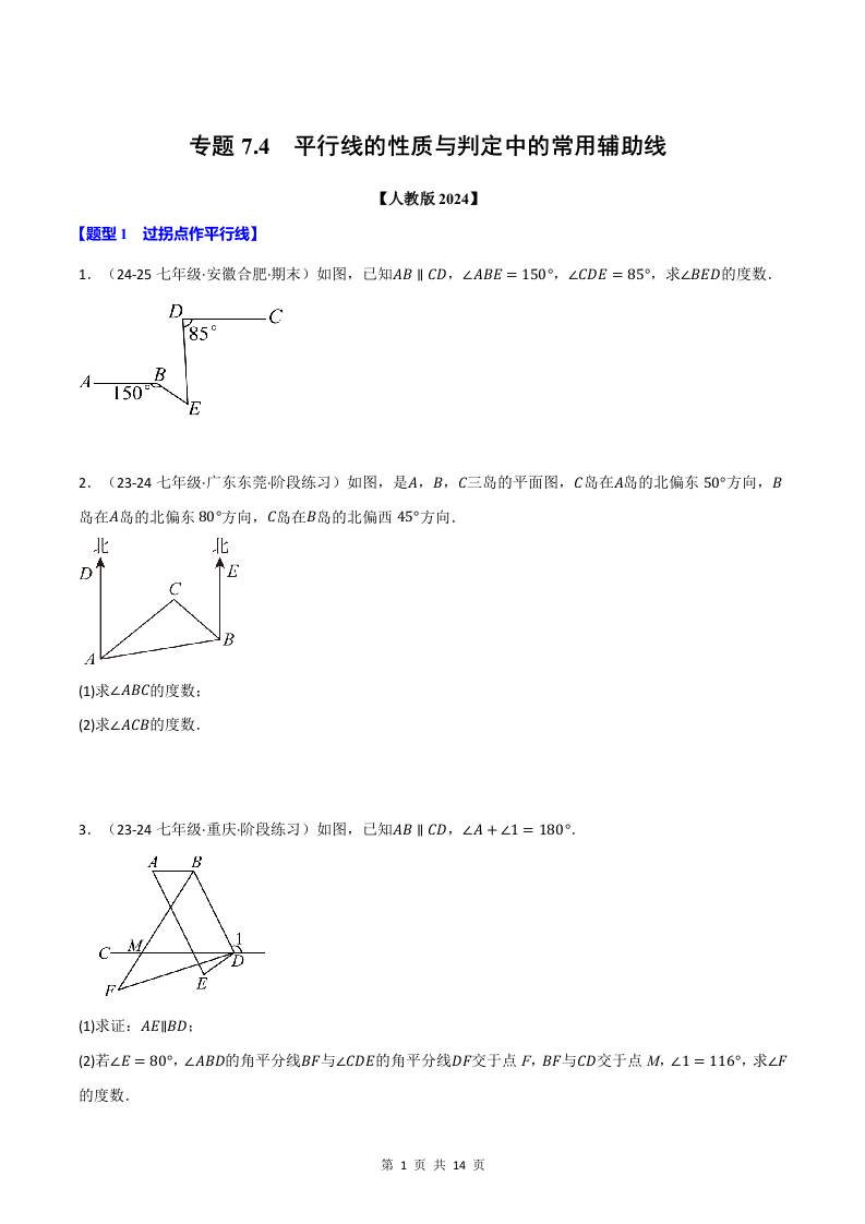 专题7.4 平行线的性质与判定中的常用辅助线(人教版2024)(原卷版)