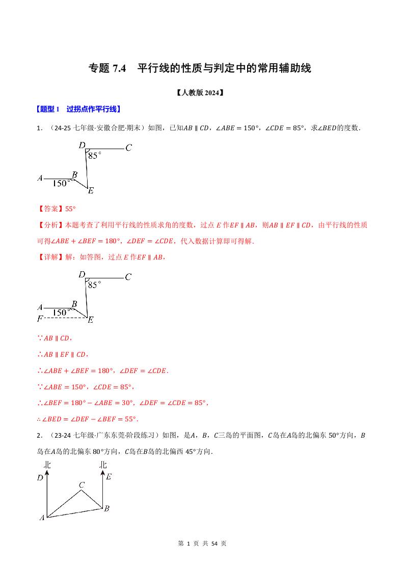 专题7.4 平行线的性质与判定中的常用辅助线(人教版2024)(解析版)