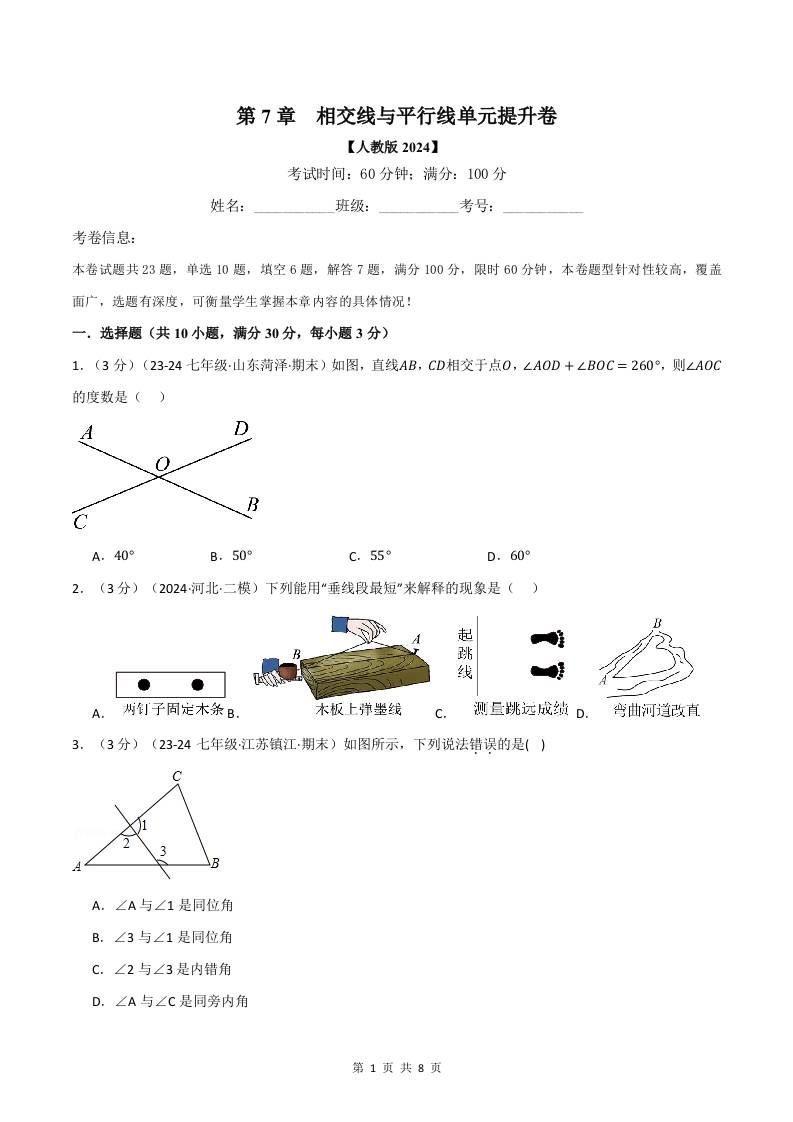 专题7.7 相交线与平行线单元提升卷(人教版2024)(原卷版)