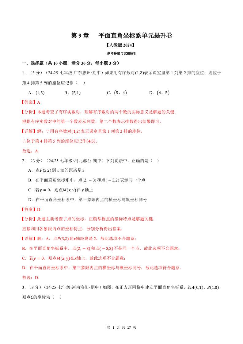 专题9.4 平面直角坐标系单元提升卷(人教版2024)(解析版)