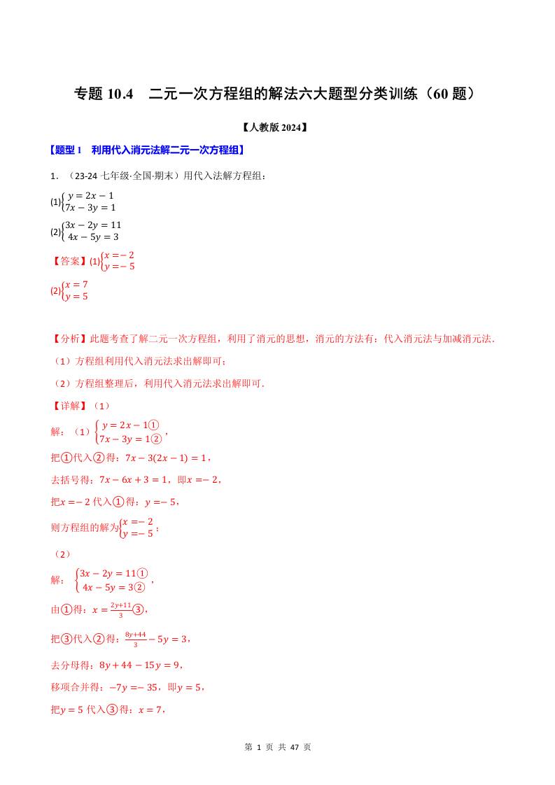专题10.4 二元一次方程组的解法六大题型分类训练(60题)(解析版)