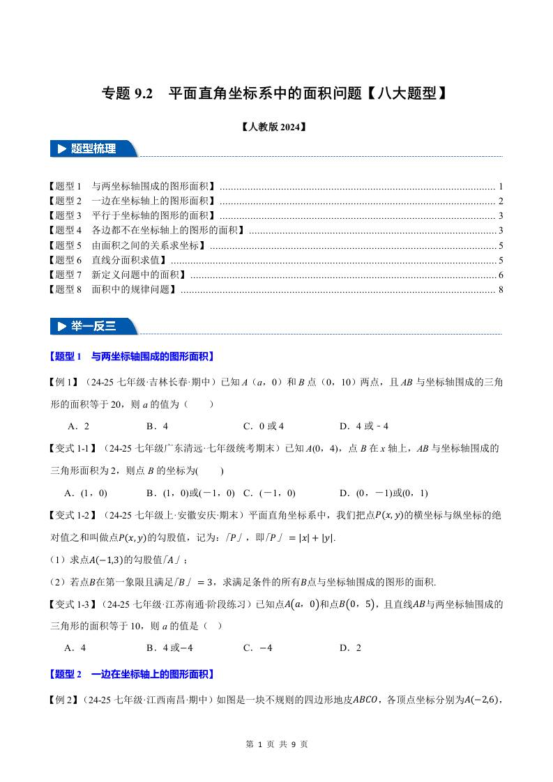 专题9.2 平面直角坐标系中的面积问题【八大题型】(举一反三)(人教版2024)(解析版)