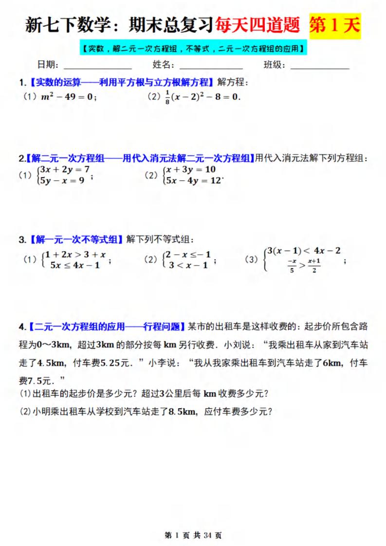 七下数学人教版期末复习每天4道题(原卷) (2)