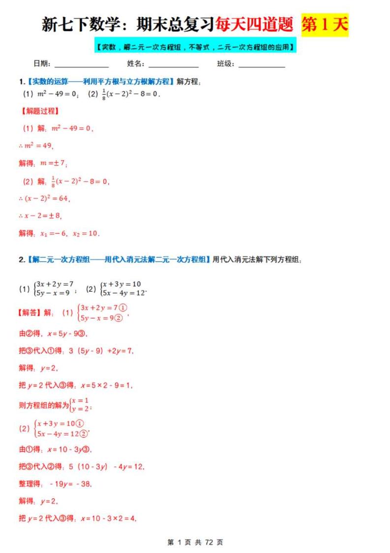 七下数学人教版期末每天4道题(解析版)