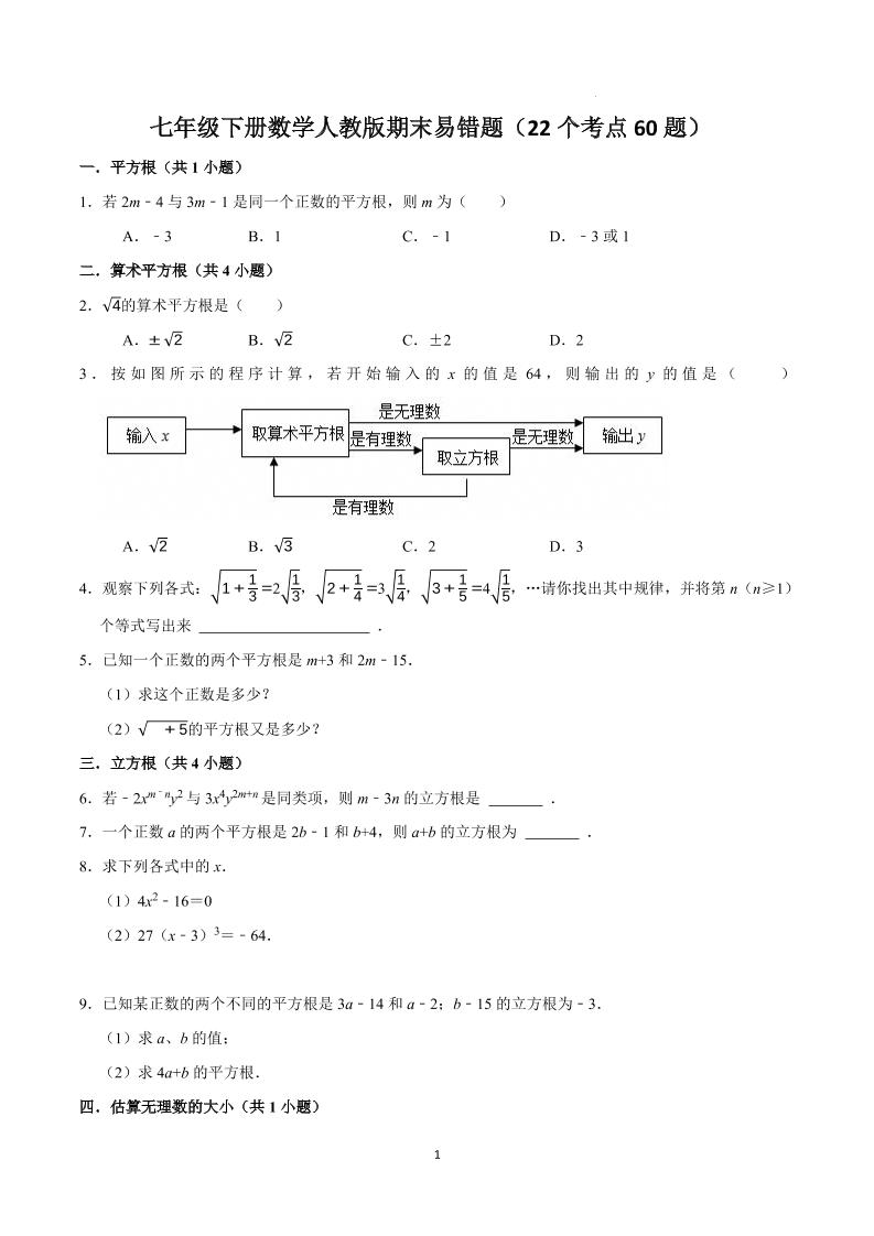 七年级下册数学人教版期末易错题(22个考点60题)(原卷版)