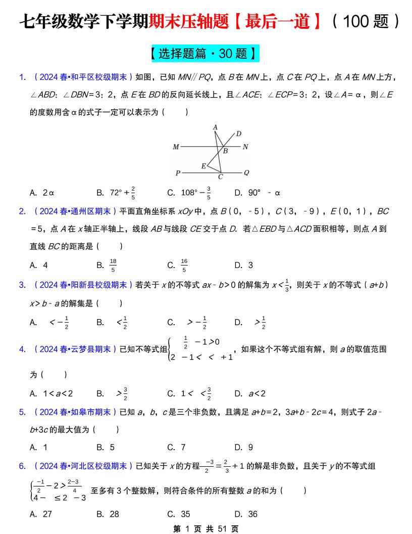 七年级数学下学期期末压轴题【最后一道】(100题)(必考点分类集训)(人教版2024)(原卷版)