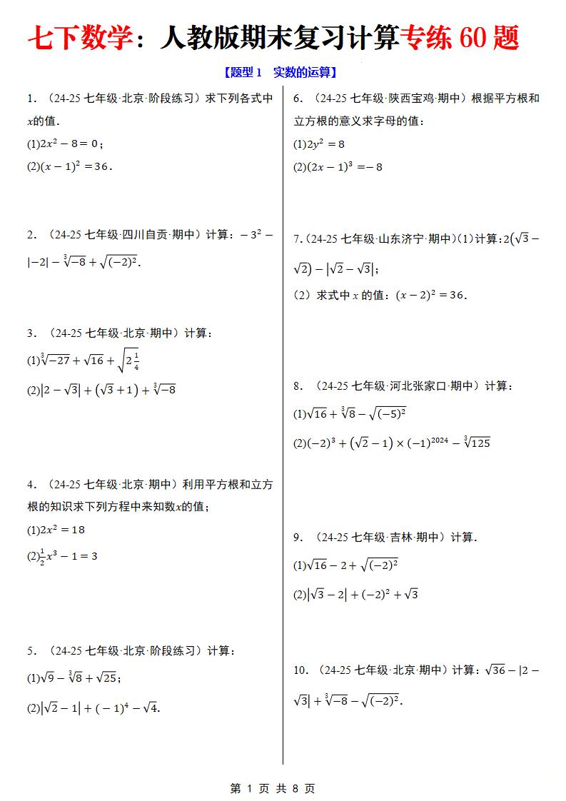 期末复习之计算题三大题型(60题)(人教版2024-2025)(原卷版)