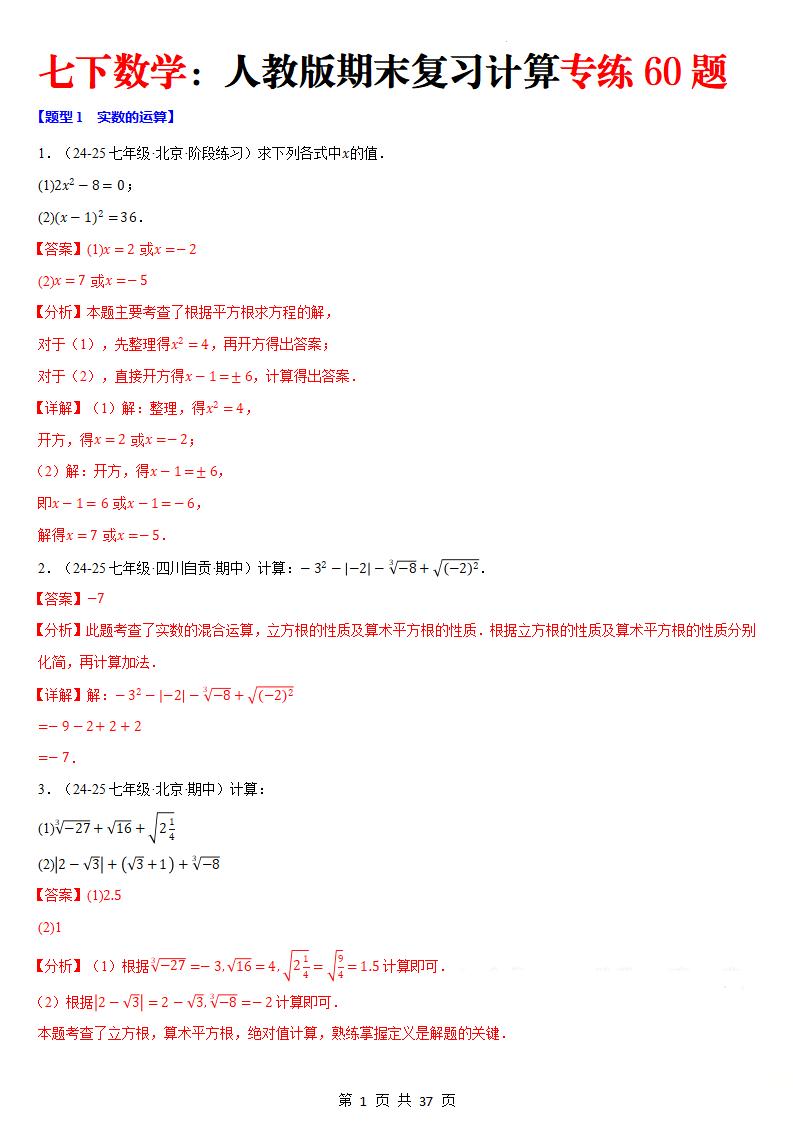 期末复习之计算题三大题型(60题)(人教版2024-2025)(解析版)(1)