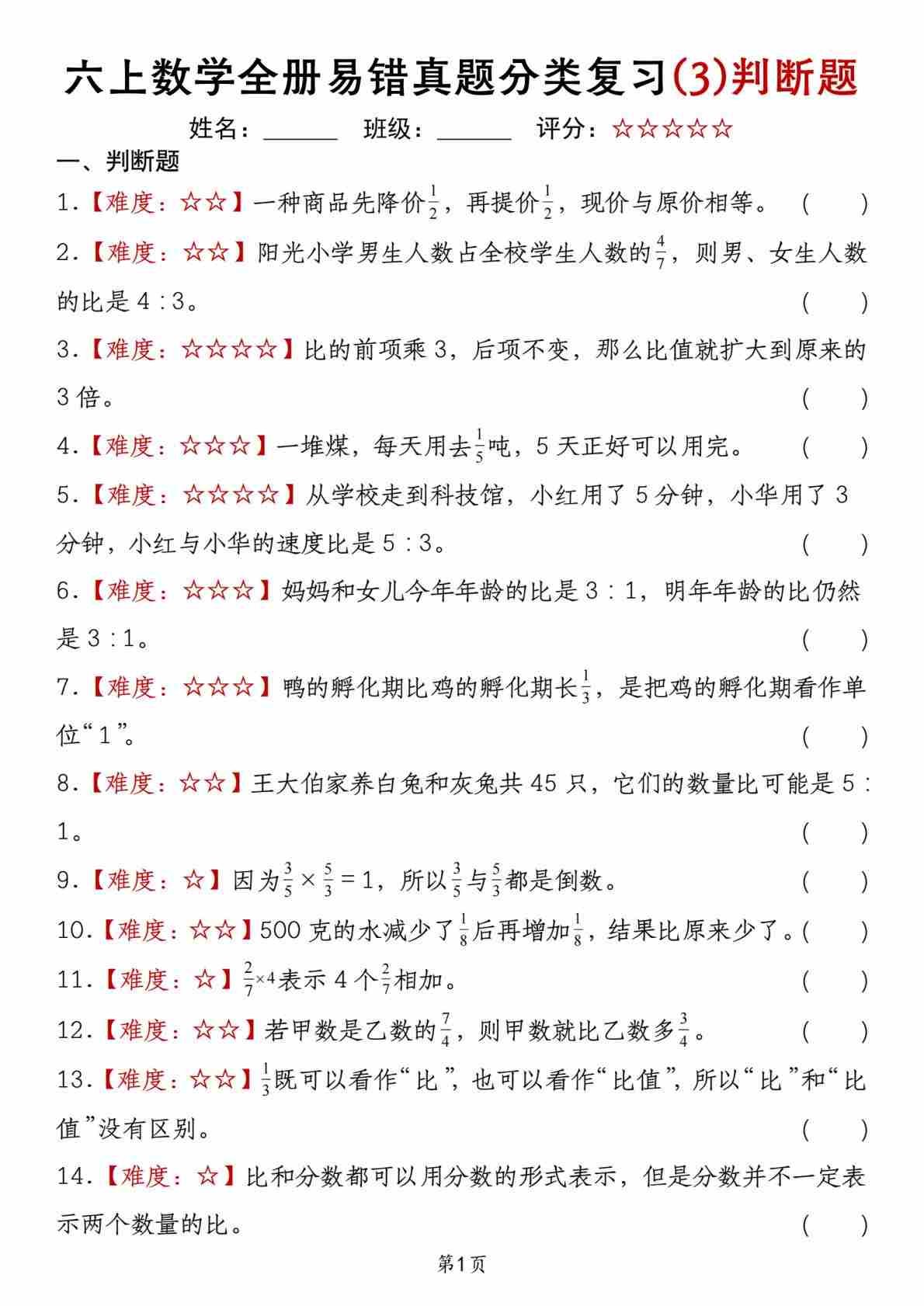六上人教版数学【全册易错真题分类复习(3)判断题】
