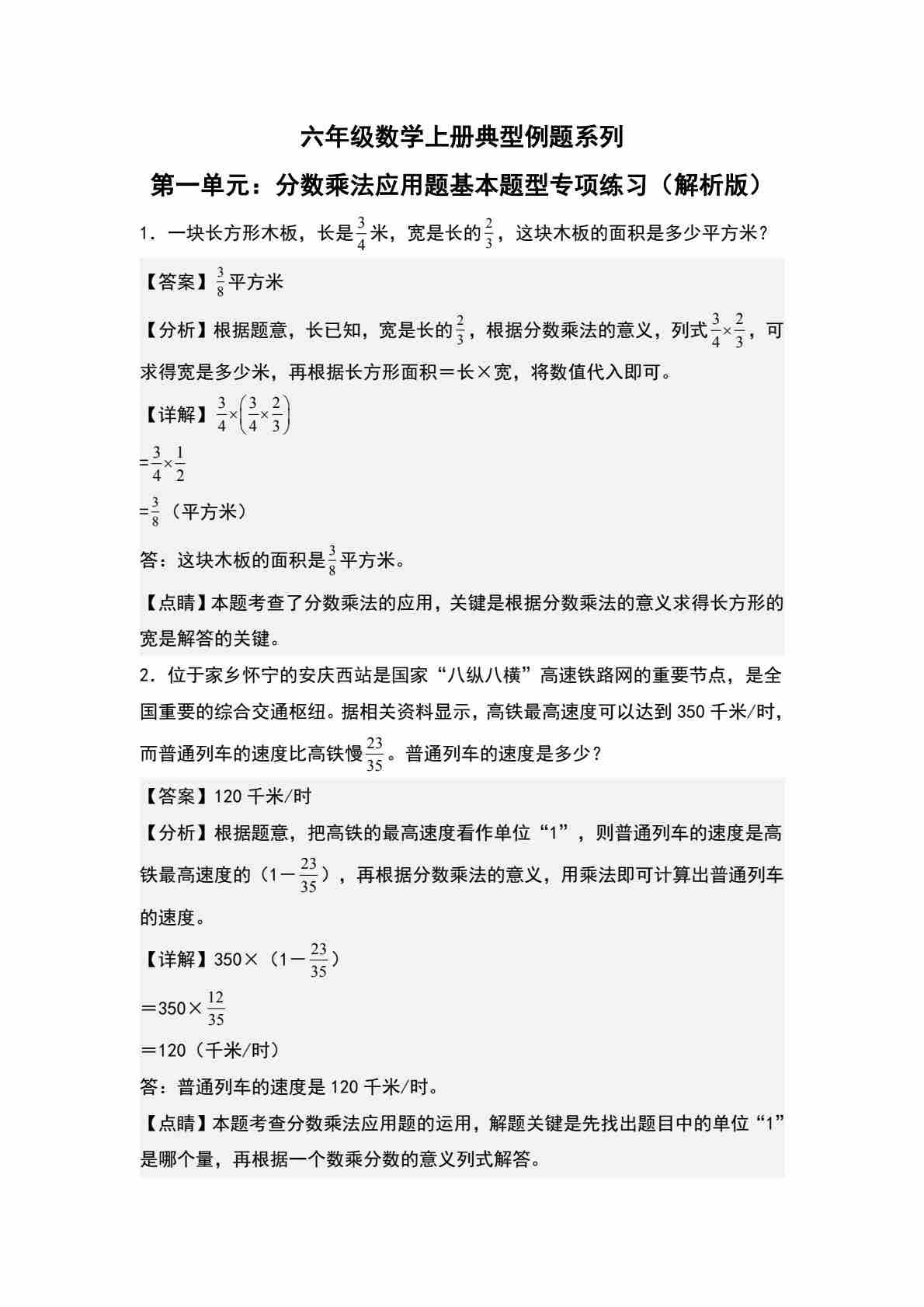 六上人教版数学【第一单元:分数乘法应用题基本题型专项练习-典型例题系列(解析版)】