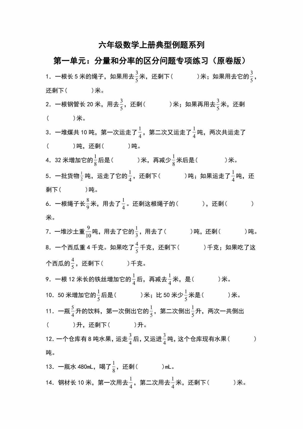 六上人教版数学【第一单元:分量和分率的区分问题专项练习-典型例题系列(原卷版)】