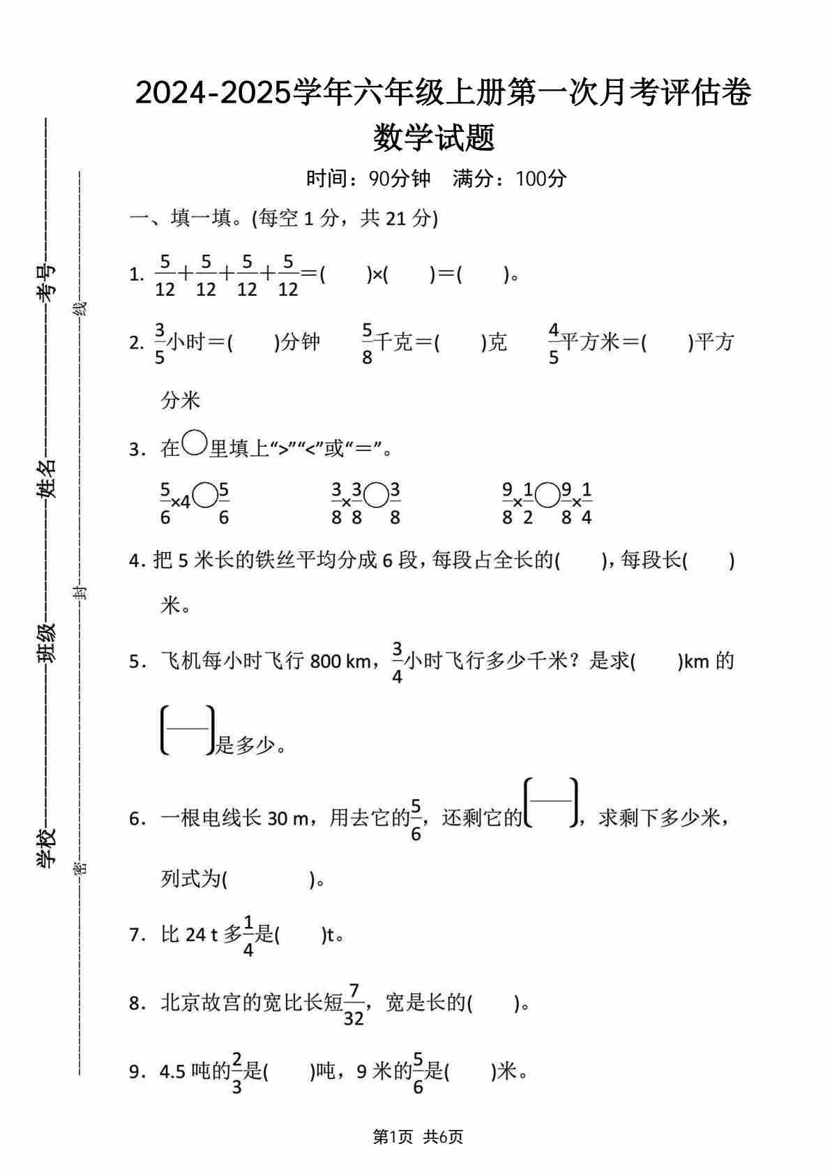 六上人教版数学【2024-2025学年第一次月考评估卷】