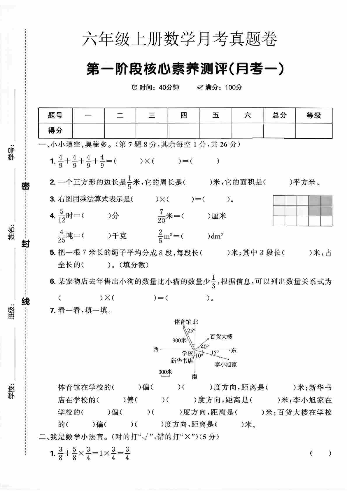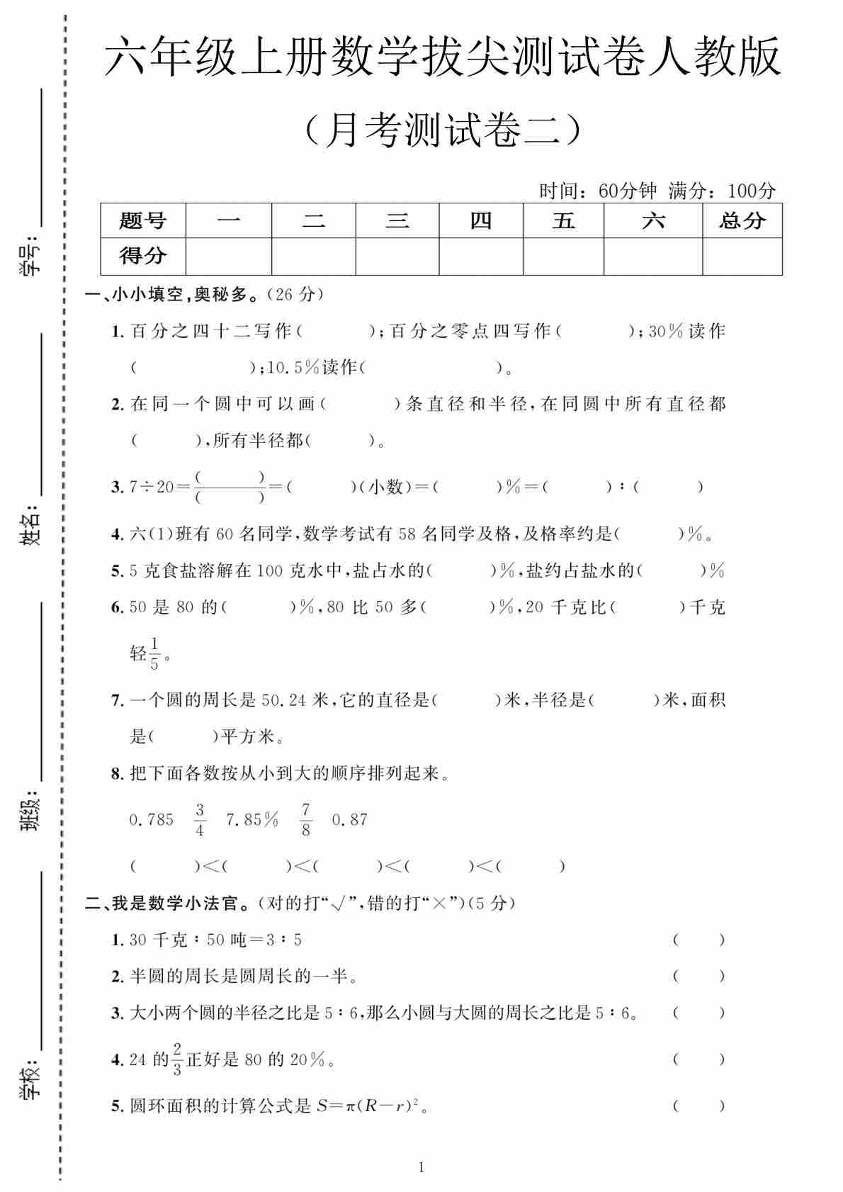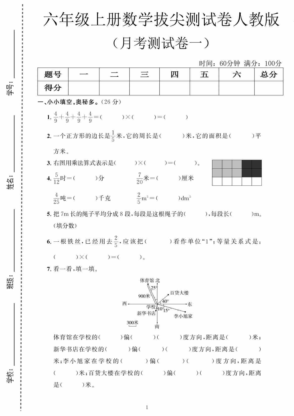 六上人教版数学【第一次月考测试卷1】