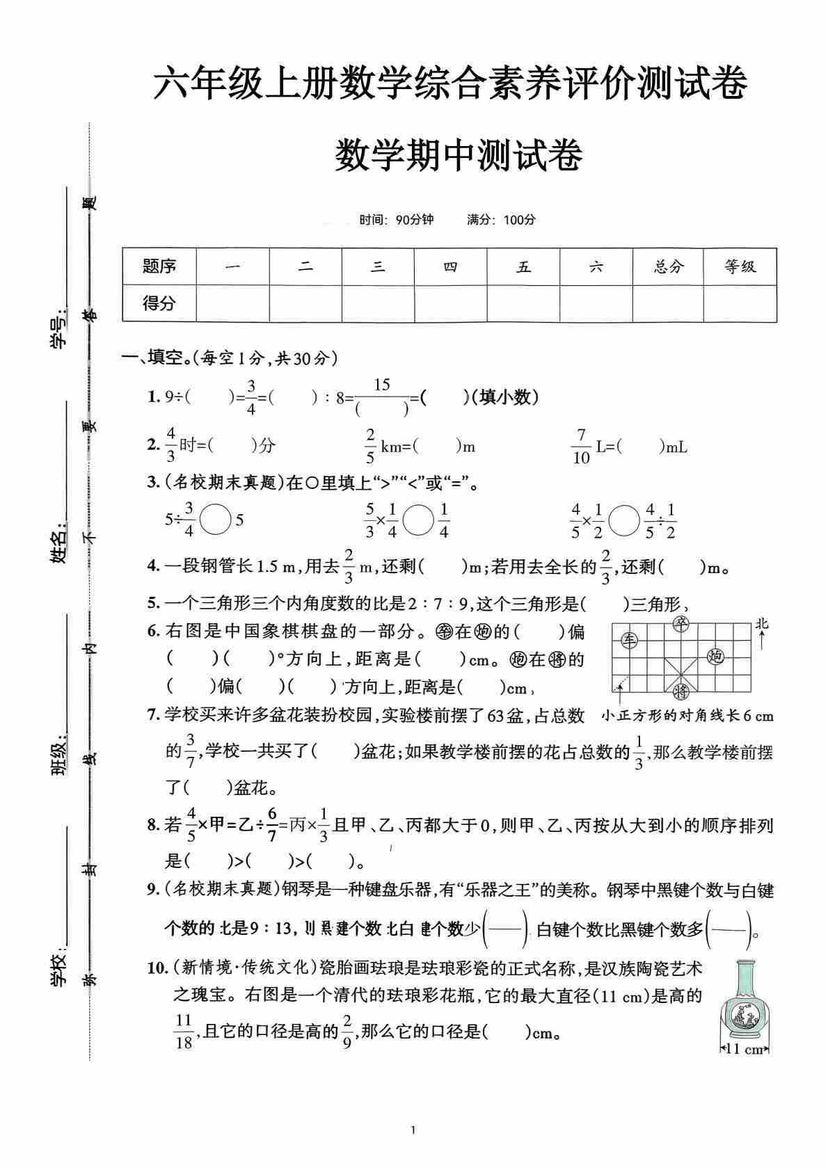 六上人教版数学【期中阶段检测卷(二)(易错篇)(含答案】)