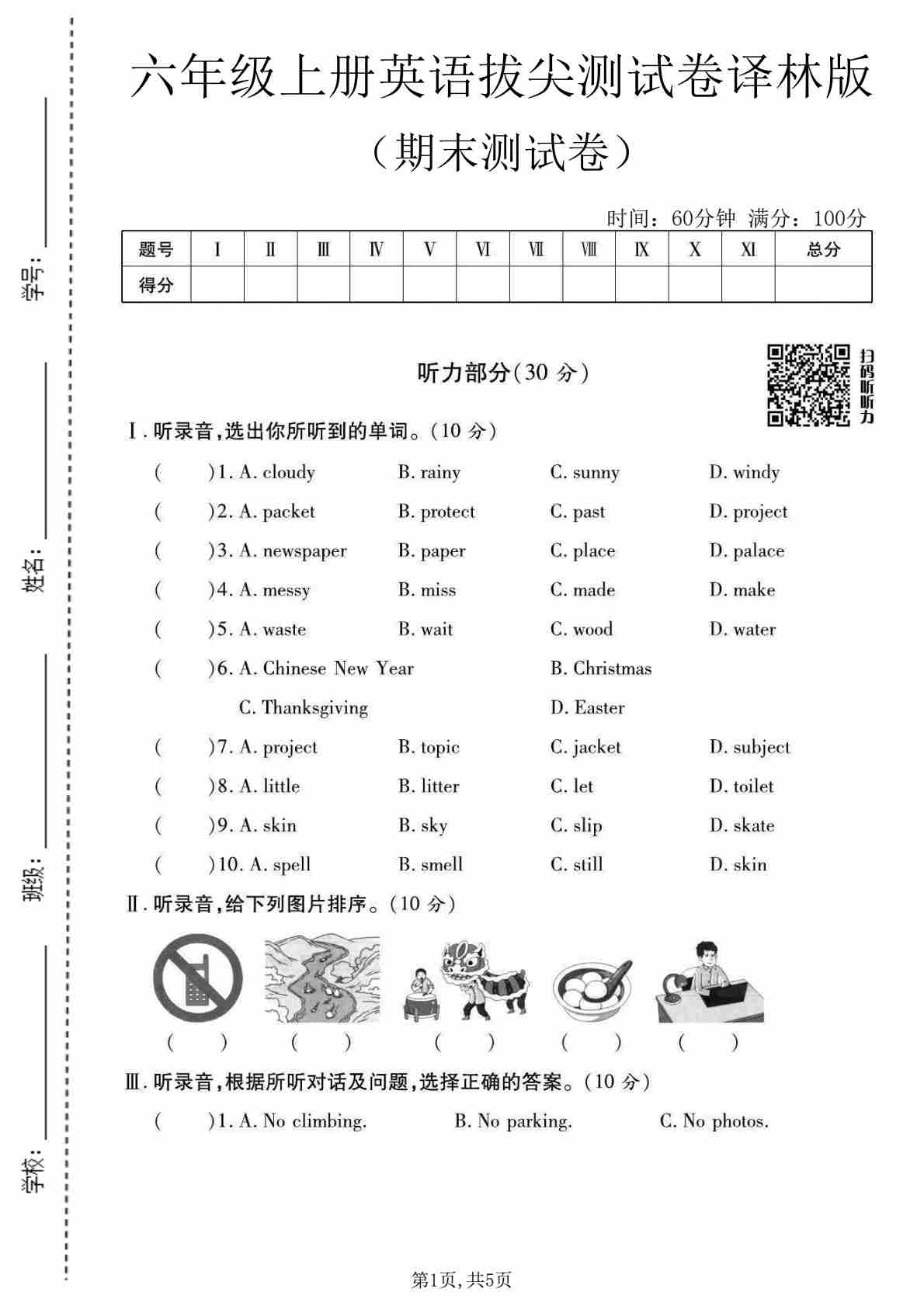 牛津译林六年级上学期期末测试卷(三起)(无听力音频)
