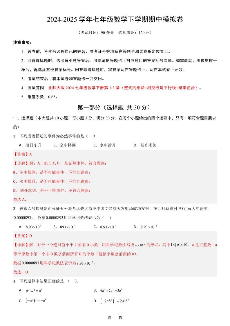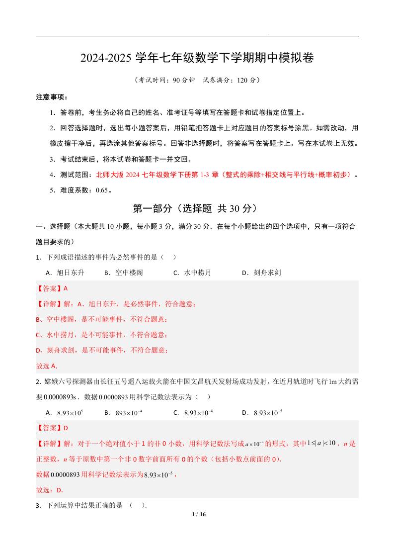 七年级数学期中模拟卷(全解全析)-(北师大2024-2025版)