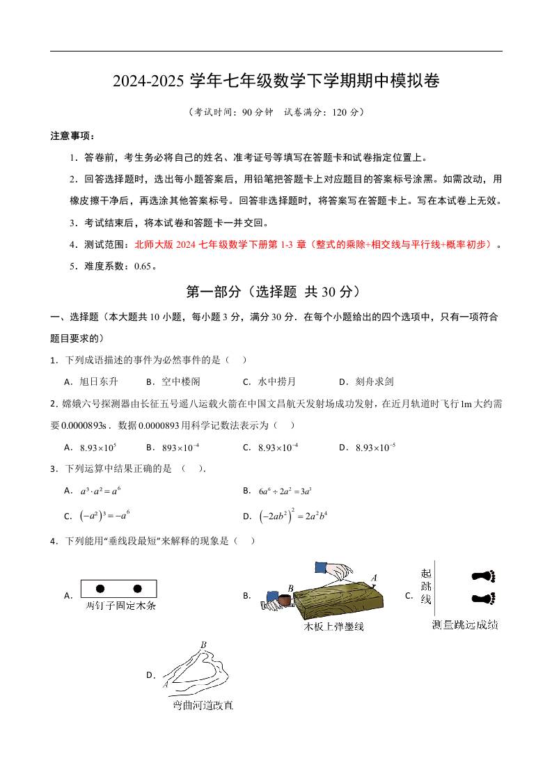 【北师】7下数学期中卷02【第1-第4章第1节】