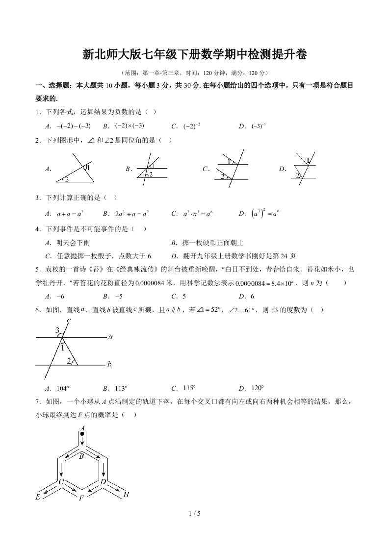 新北师大版七年级下册数学期中检测提升卷(范围:第一章-第三章)(学生版)