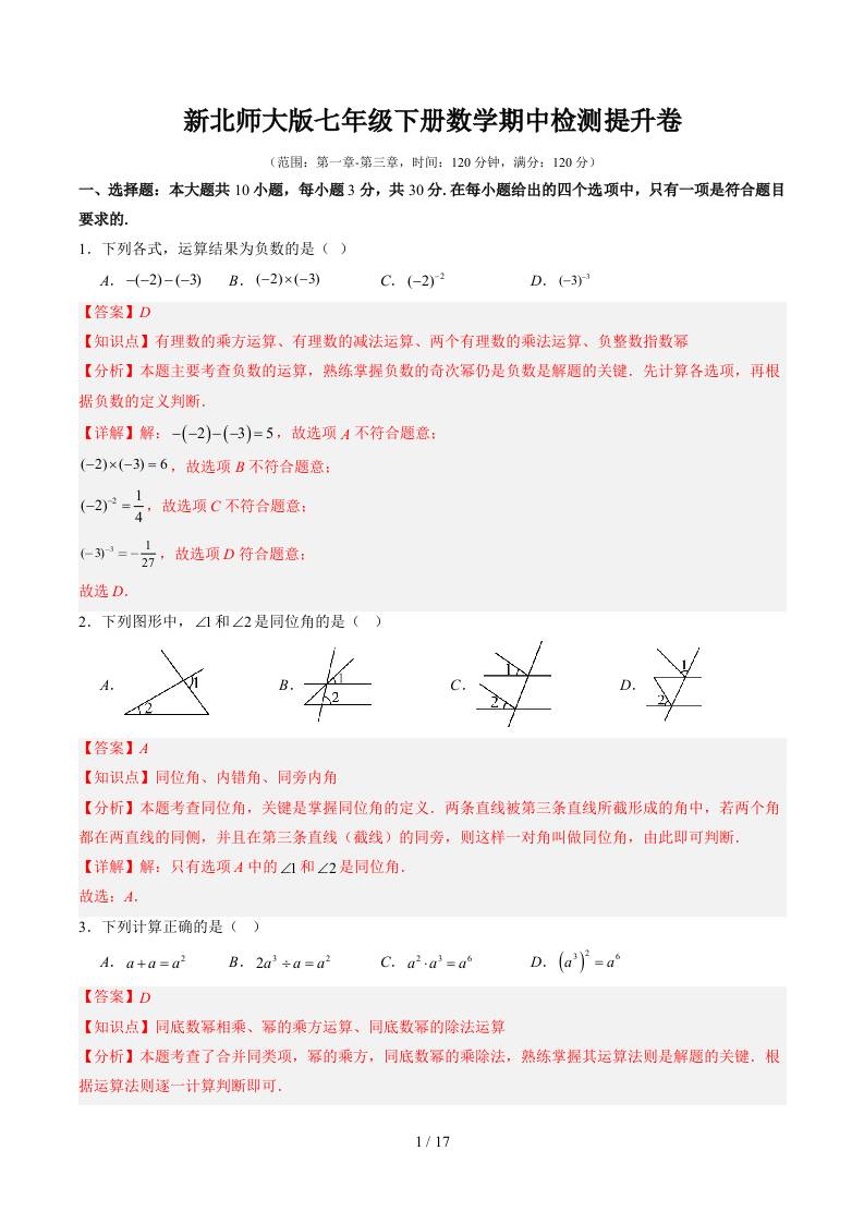 新北师大版七年级下册数学期中检测提升卷(范围:第一章-第三章)(教师版)