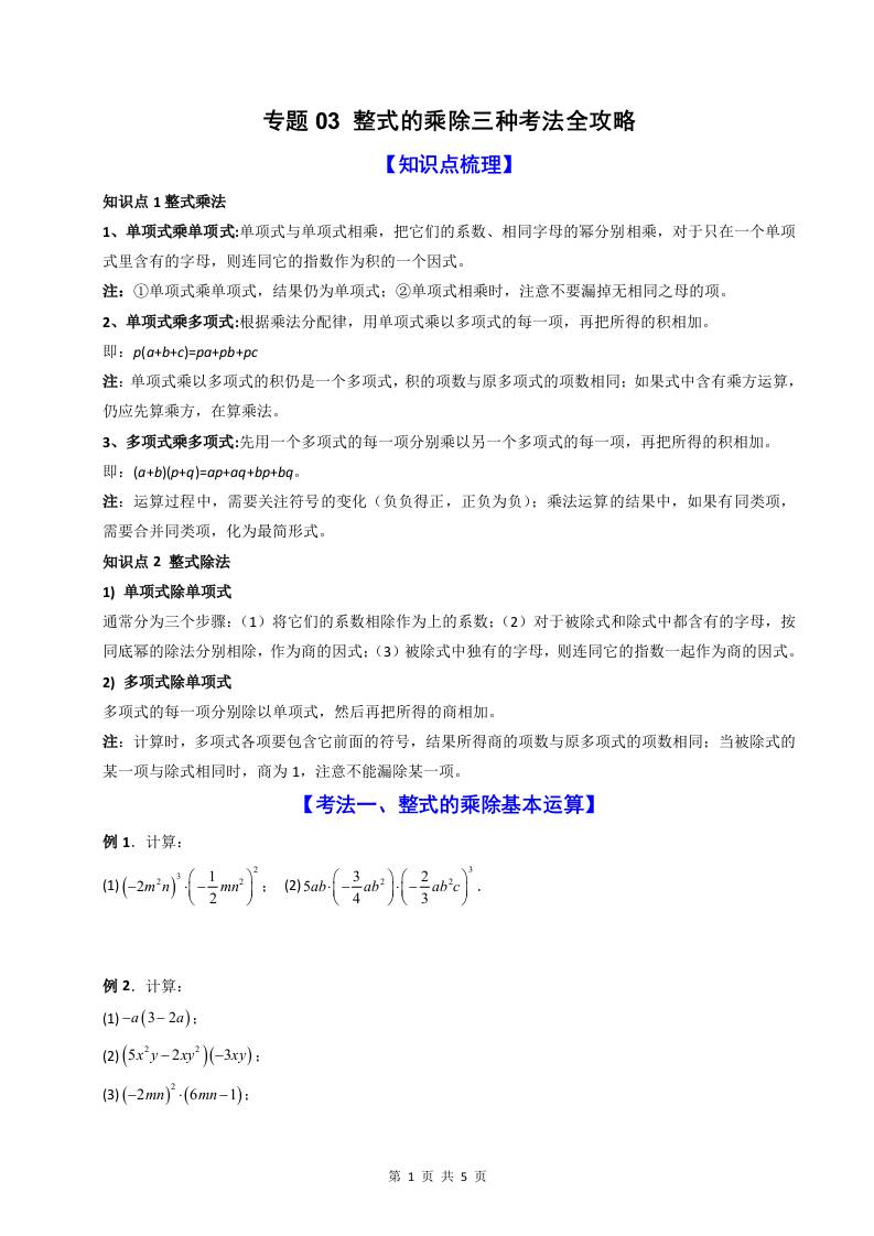 专题03 整式的乘除三种考法全攻略(原卷版)