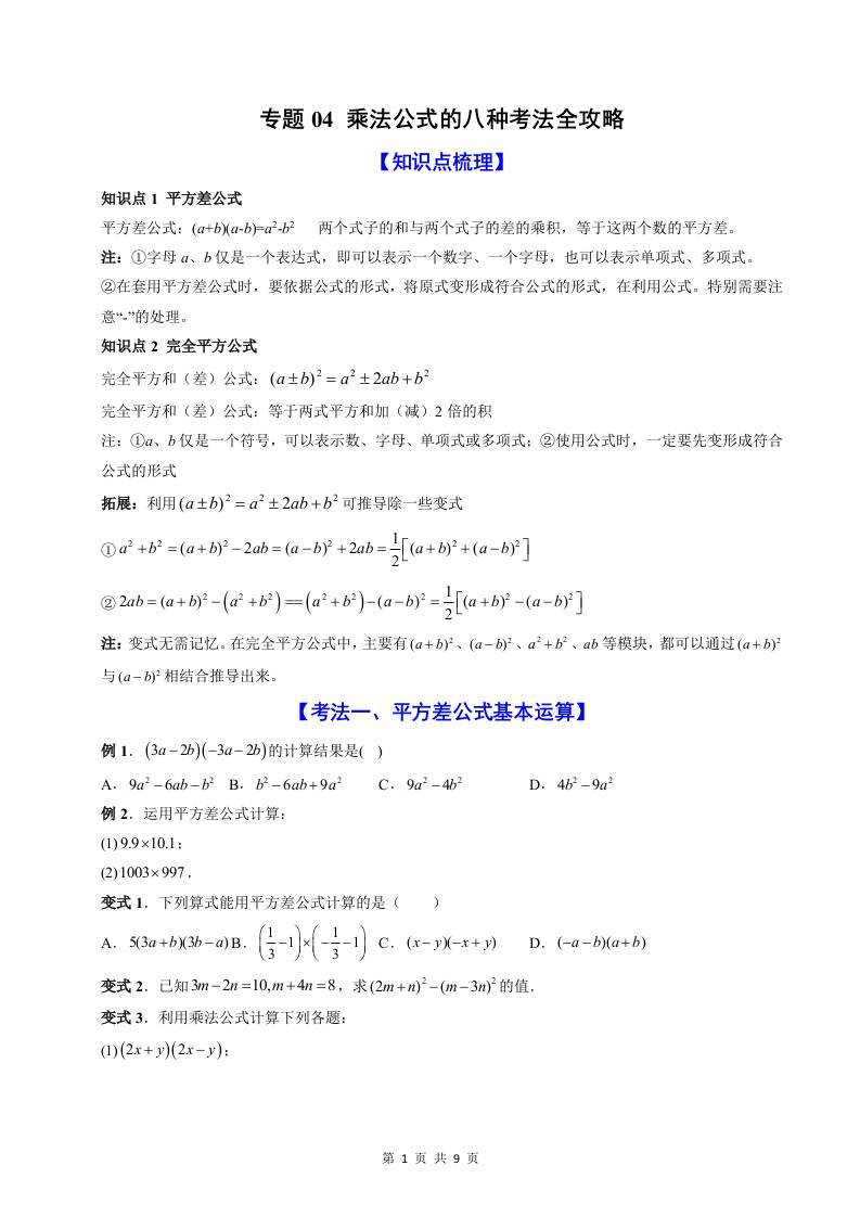 专题04 乘法公式八种考法全攻略(原卷版)