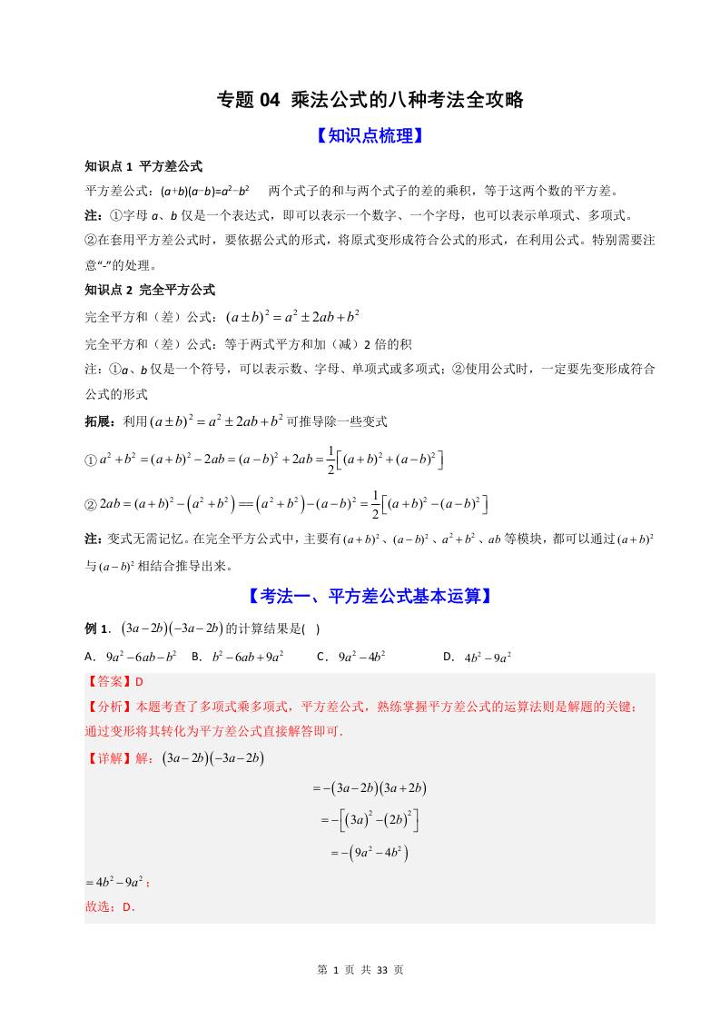专题04 乘法公式八种考法全攻略(解析版)