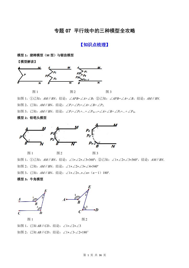 专题07 平行线中的三种模型全攻略(原卷版)