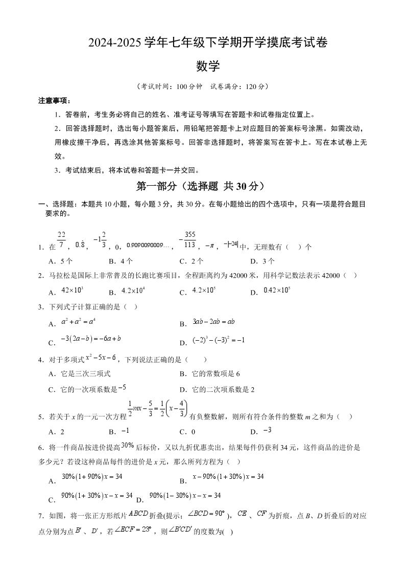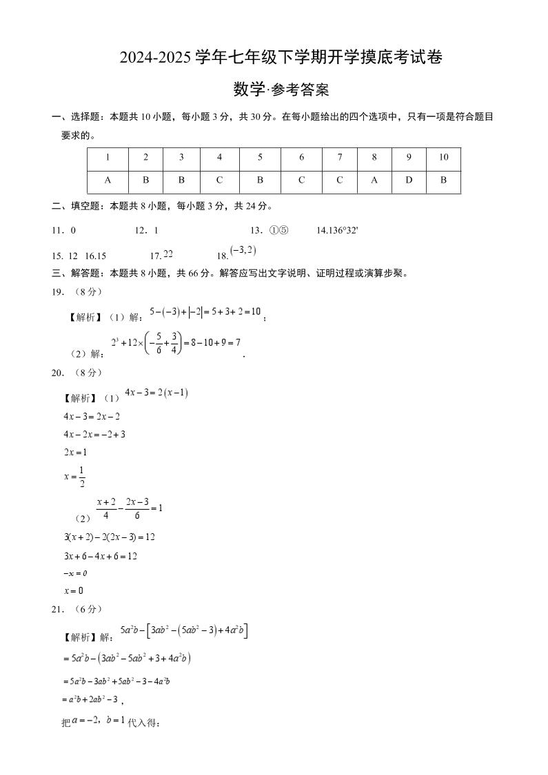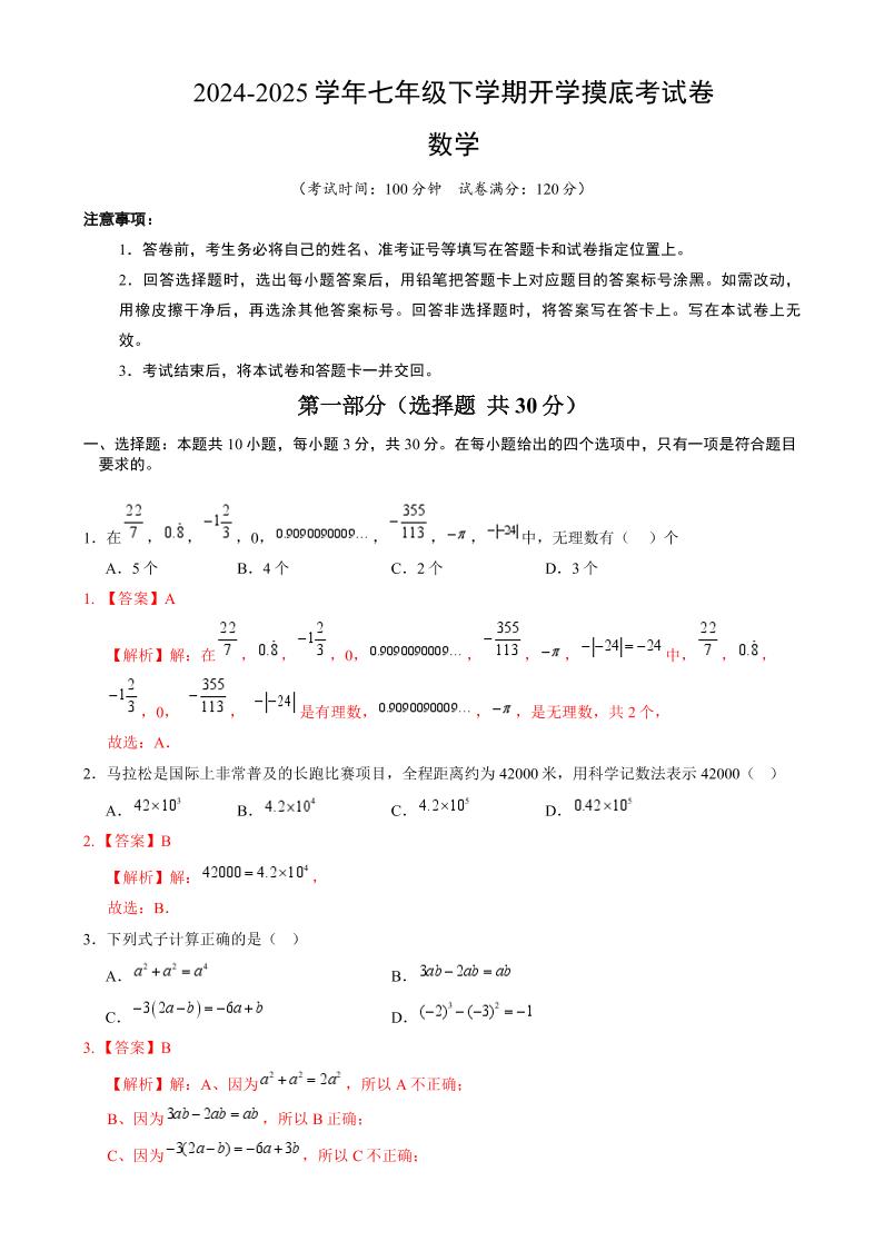 七年级数学开学摸底考(苏科版2024七上全部)(参考答案)