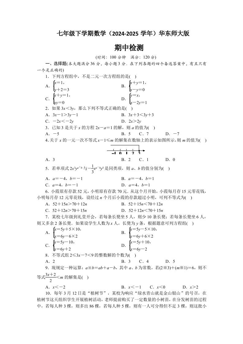华东师大版七年级数学下册期中综合评价
