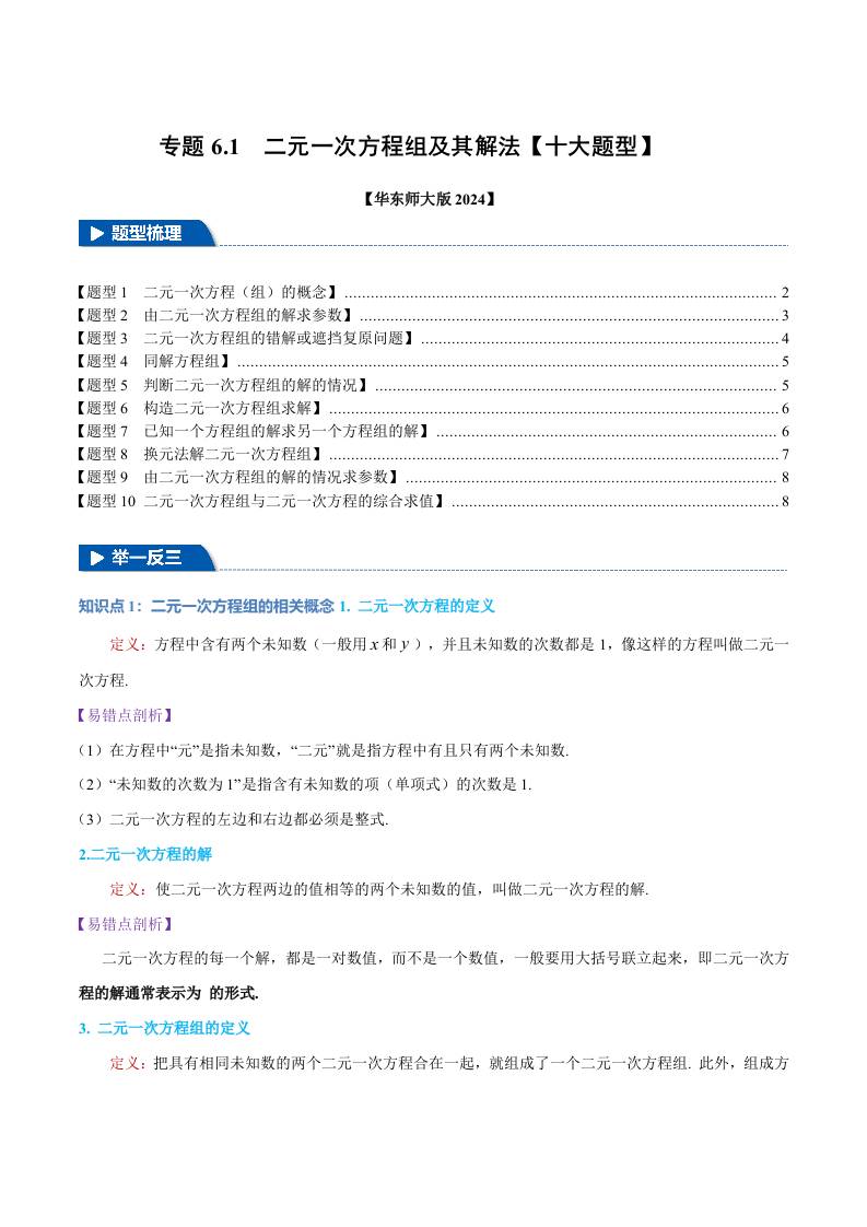 专题6.1 二元一次方程组及其解法【十大题型】(举一反三)(华东师大版2024)(解析版)