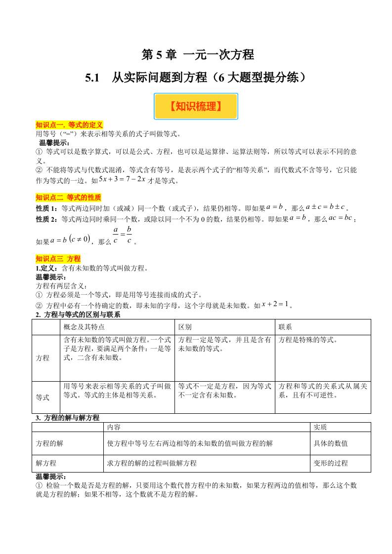 5.1 从实际问题到方程(6大题型提分练)(原卷版)