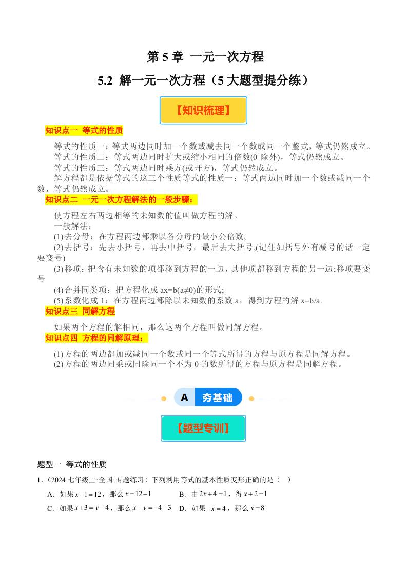 5.2 解一元一次方程(5大题型提分练)(原卷版)