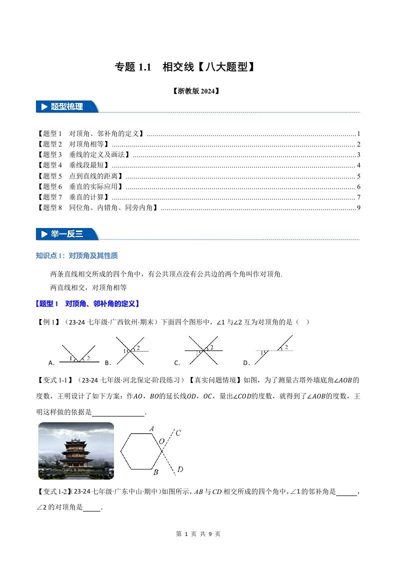 专题1.1 相交线【八大题型】(举一反三)(浙教版2024)(原卷版)