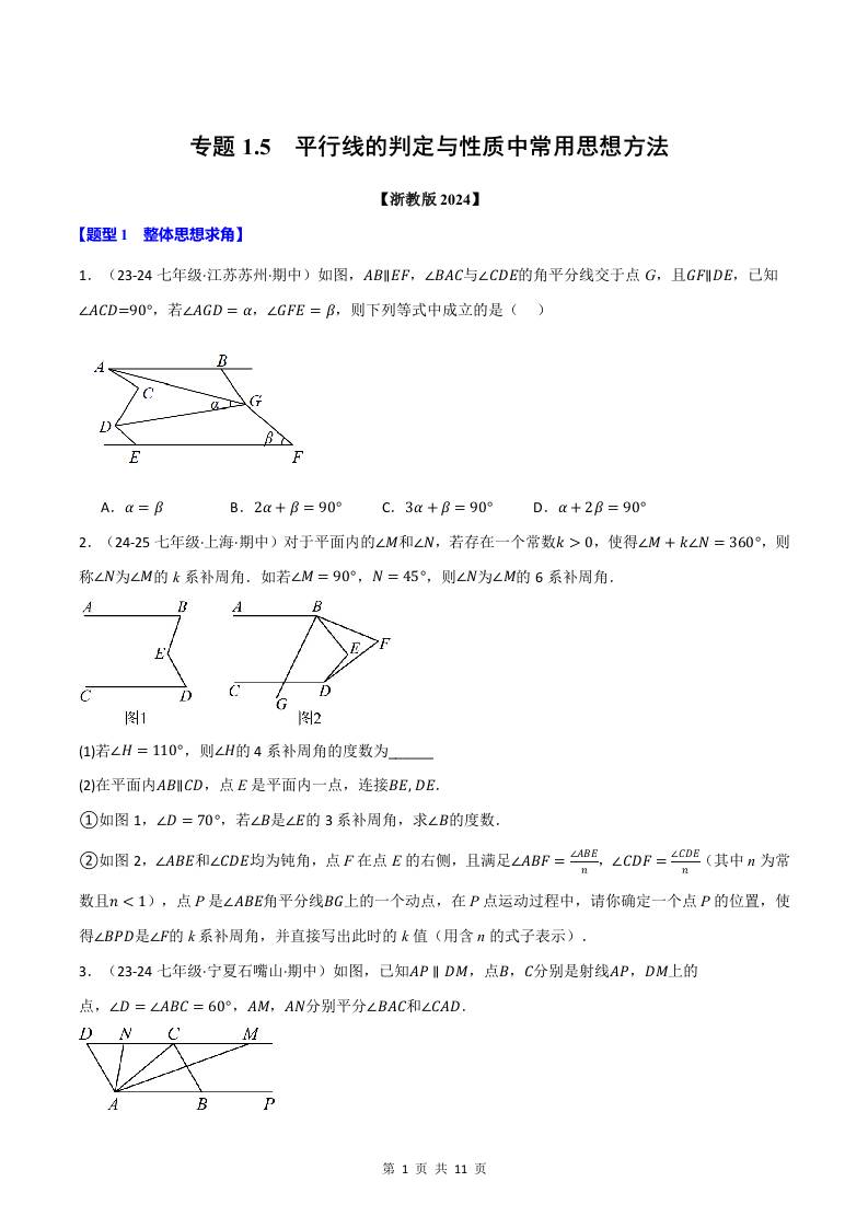 专题1.5 平行线的判定与性质中常用思想方法(浙教版2024)(原卷版)