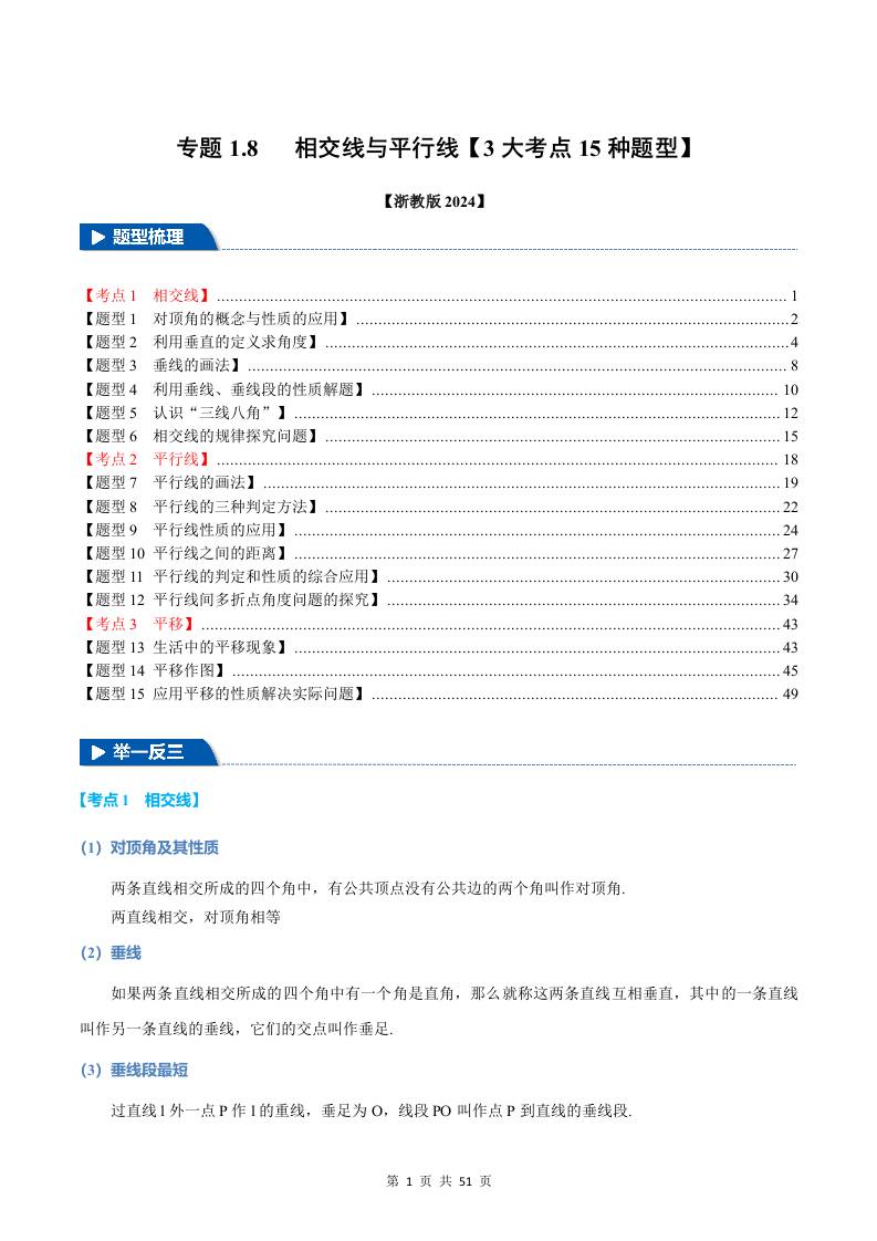 专题1.8 相交线与平行线全章专项复习【3大考点15种题型】(举一反三)(浙教版2024)(原卷版)