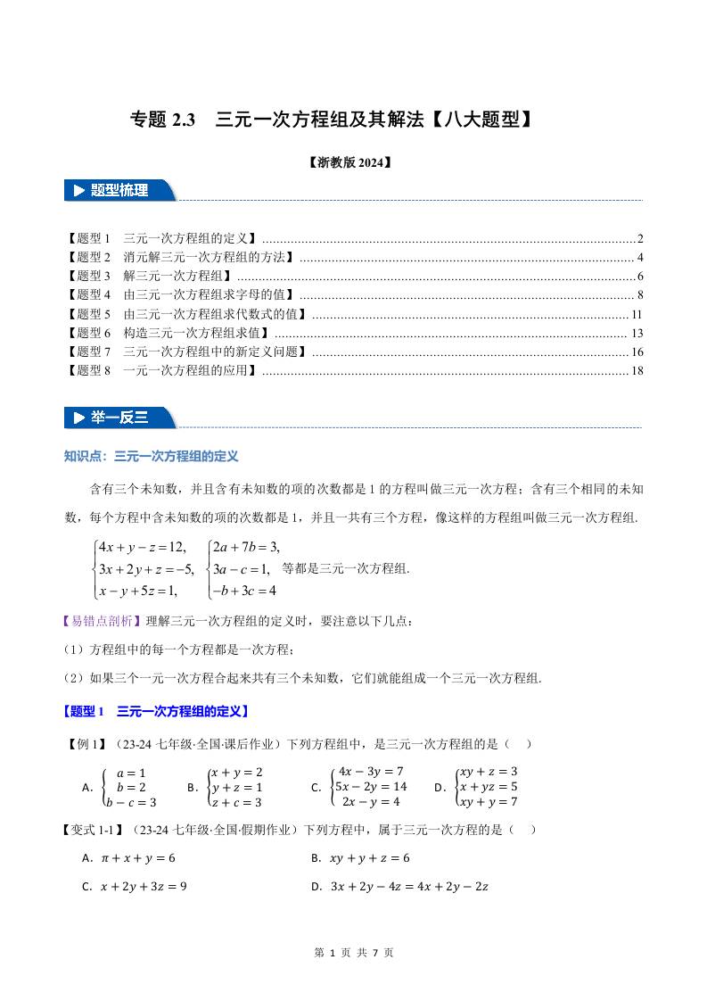 专题2.3 三元一次方程组及其解法【八大题型】(举一反三)(浙教版2024)(解析版)