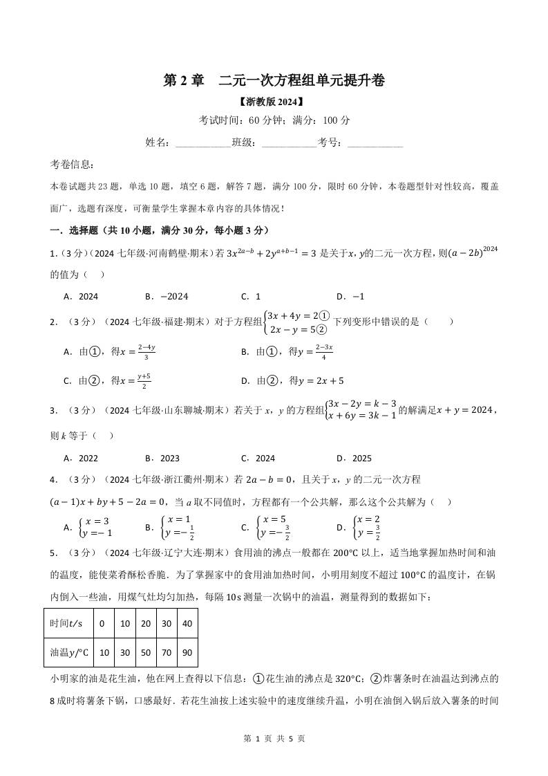 专题2.6 二元一次方程组单元提升卷(浙教版2024)(原卷版)