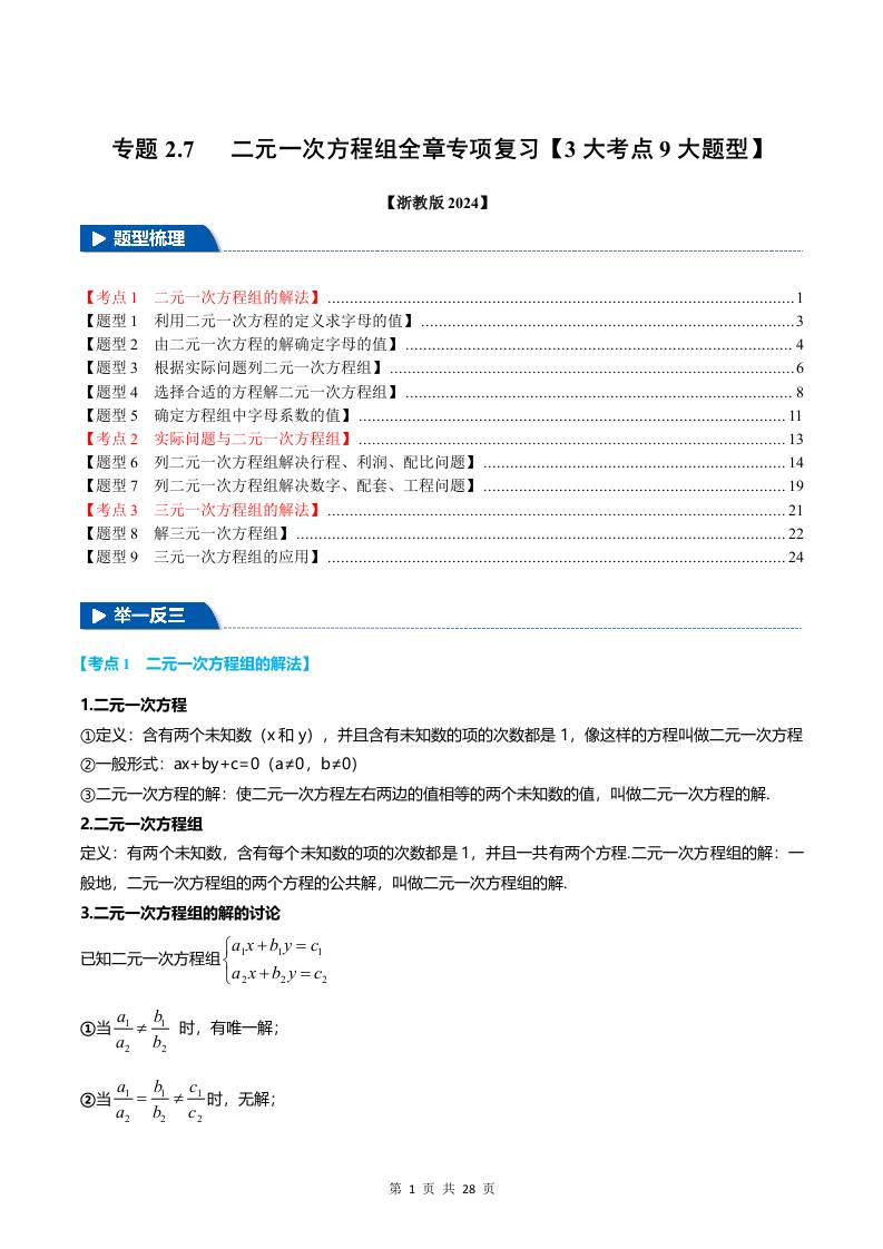专题2.7 二元一次方程组全章专项复习【3大考点9大题型】(举一反三)(浙教版2024)(解析版)