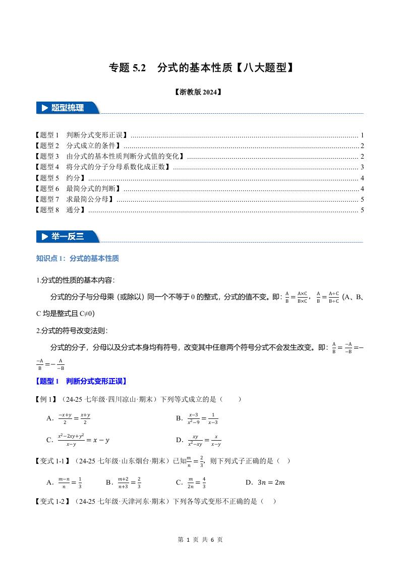 专题5.2 分式的基本性质【八大题型】(举一反三)(浙教版2024)(原卷版)
