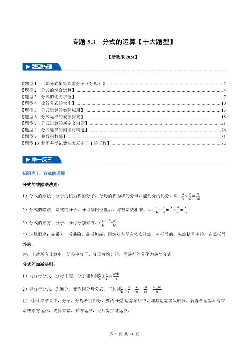 专题5.3 分式的运算【十大题型】(举一反三)(浙教版2024)(解析版)