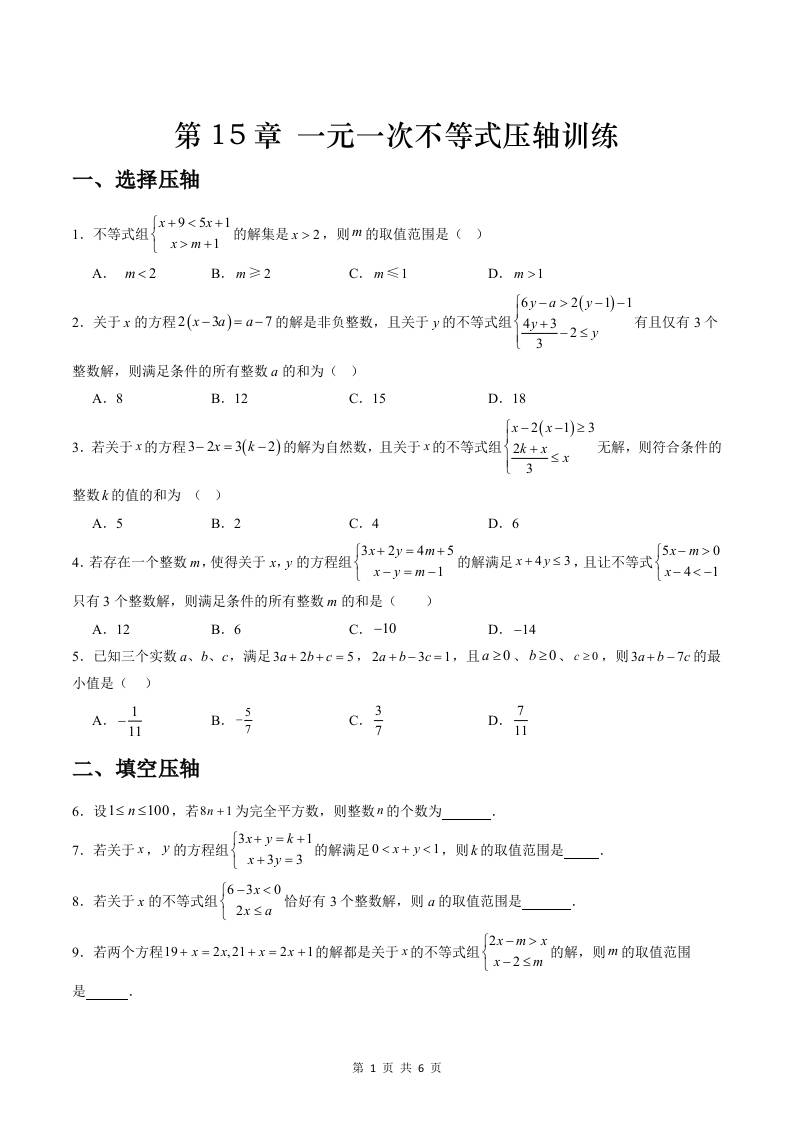 第15章一元一次不等式压轴训练(原卷版)