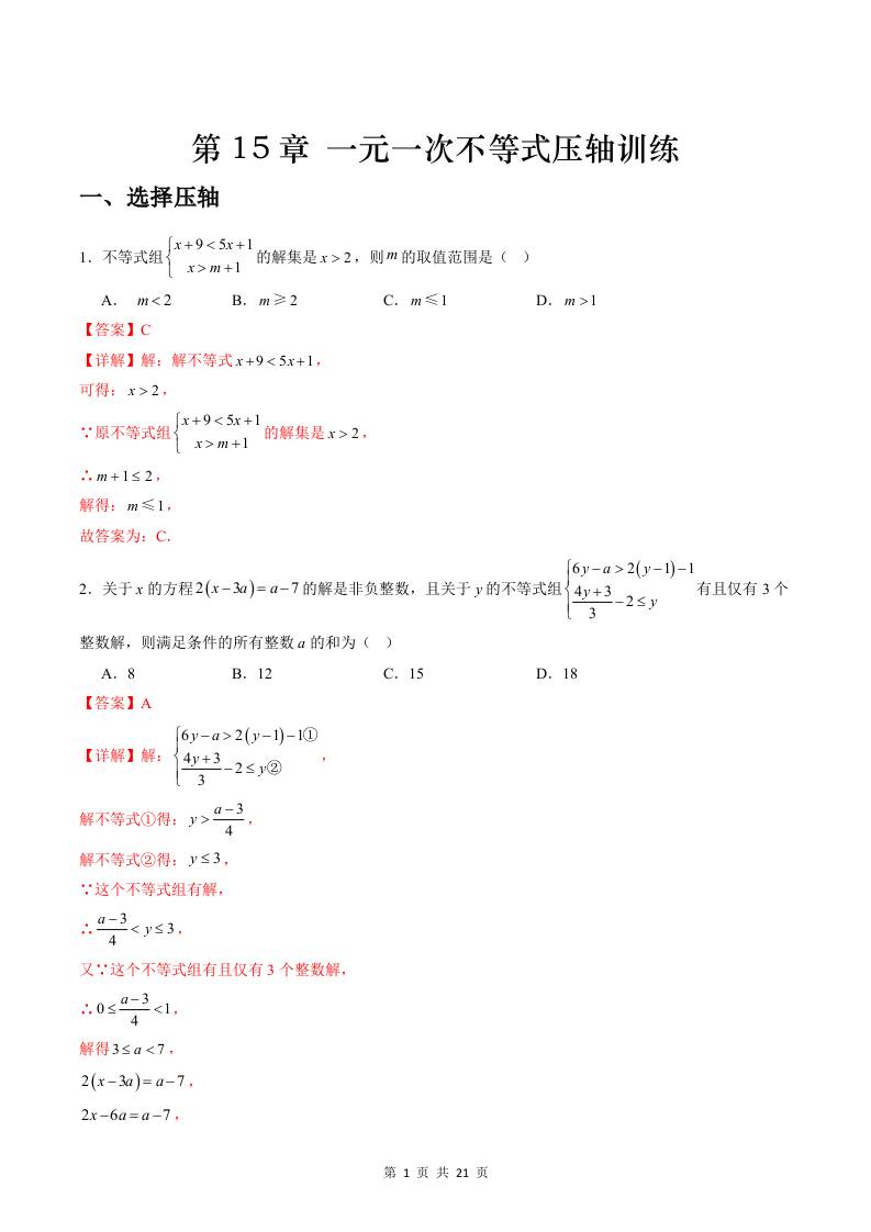 第15章一元一次不等式压轴训练(解析版)