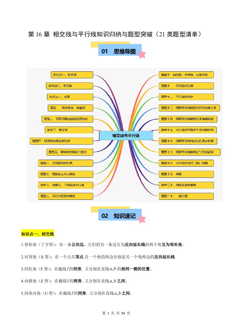 第16章 相交线与平行线 知识归纳与题型突破(21类题型清单)(原卷版)